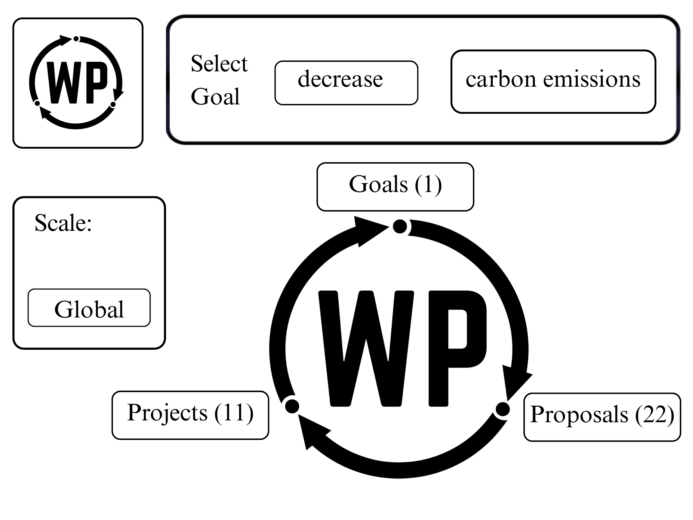 We believe that people mostly share the same goals, they just disagree on how to achieve them, and that this manifests in different choices of candidates on election day. Rather than focusing on candidates and elections, we will put these goals front and center. The things people generally want- lower grocery prices, more affordable housing, better paying jobs, and a reduction in carbon dioxide emissions- can all be measured with data. These goals are the starting point in a three-stage workflow where users join together to try and move the data point in the right direction.